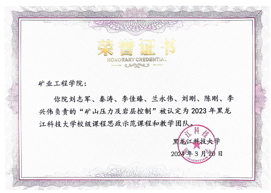 获批校级教学成果奖一等奖2项,中国煤炭行业教学成果奖二等奖2项;获批省级教改项目3项,省实验教学和教学实验室建设研究项目1项;在省级一流课程《矿山压力及岩层控制》的基础上,申报了国家级一流课程;《矿山压力及岩层控制》获校级课程思政示范课程及教学团队,并获校级课程思政优秀案例;《选矿学Ⅲ》成功在智慧树平台上线,实现了线上线下混合式授课,有3所学校采用平台授课;《龙江矿藏》课程获批中国地质学会精品地学研学课;出版教材3部。