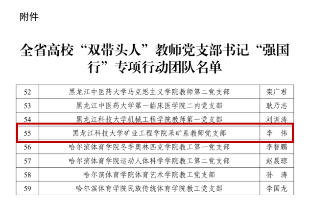 近日,黑龙江省委教育工委公布了全省高校“双带头人”教师党支部书记“强国行”专项行动团队名单,金年会官网采矿工程系教师党支部(负责人:李伟)入选。