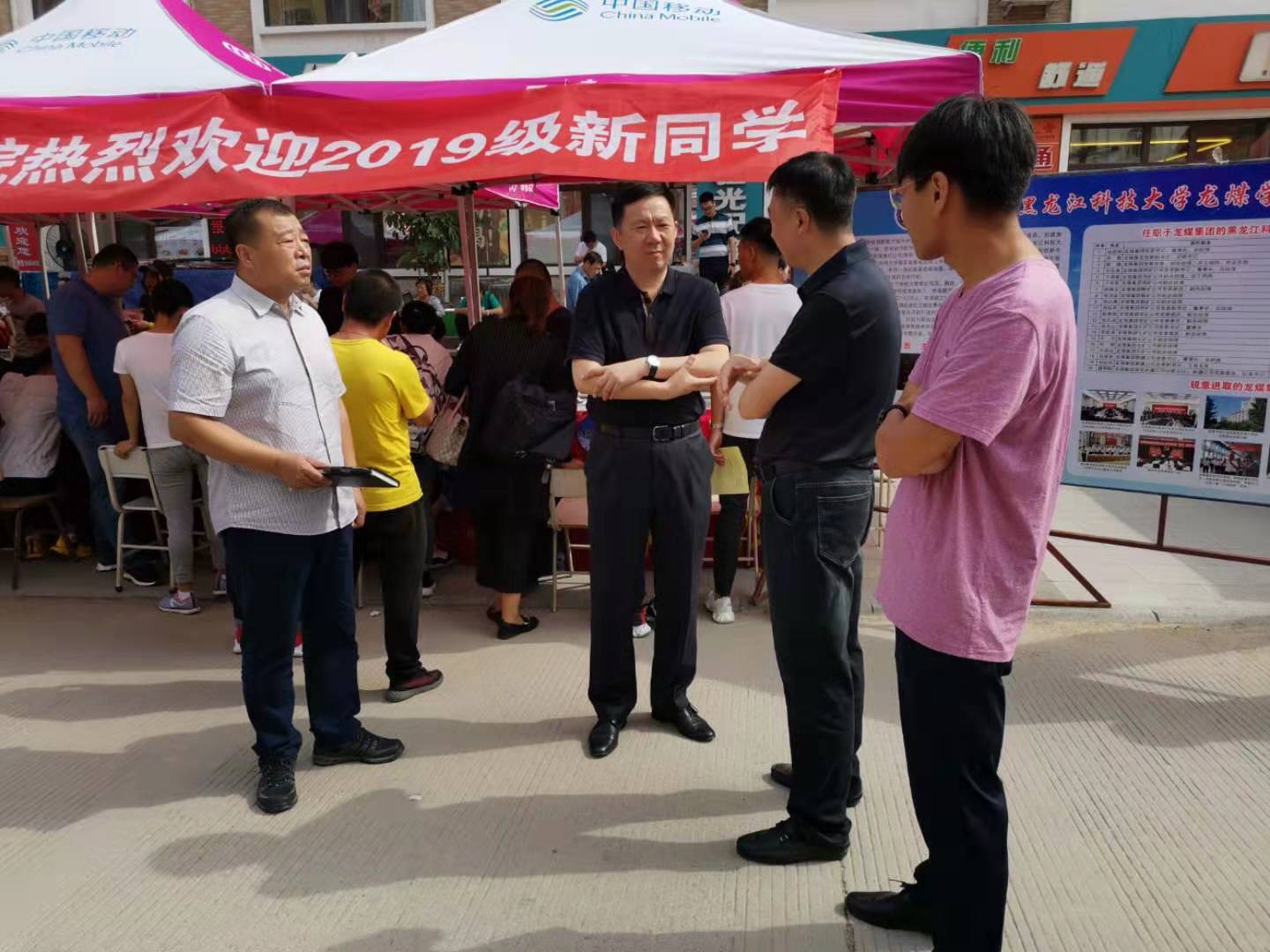 龙煤集团组织部部长王会敏、副部长周振国、干部管理处处长布振琏与高德民副院长咨询新生报到情况