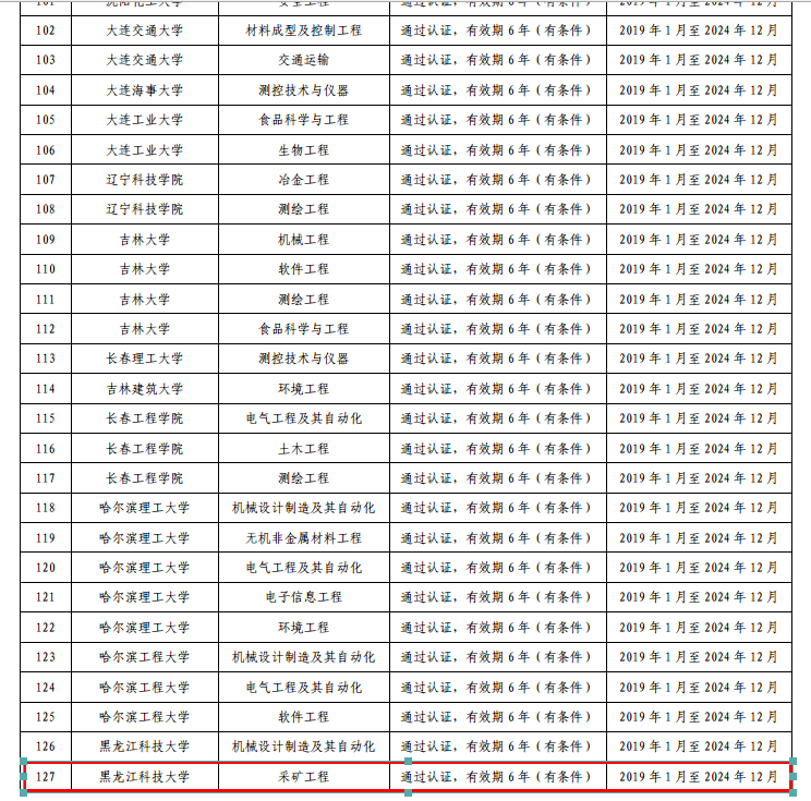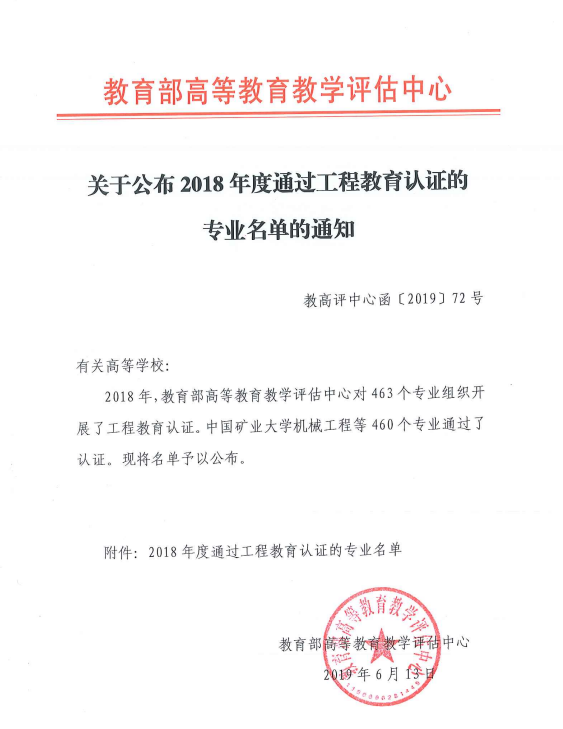 近日,教育部高等教育教学评估中心和中国工程教育专业认证协会同时发布通知,公布了2018年全国工程教育专业认证的认证结论,全国高校共有460个专业通过认证。金年会官网采矿工程专业名列其中,认证有效期为6年(有条件),自20191月至202412月。这是金年会官网工科专业首次通过全国工程教育专业认证,标志着采矿工程专业纳入了《华盛顿协议》互认名单。
