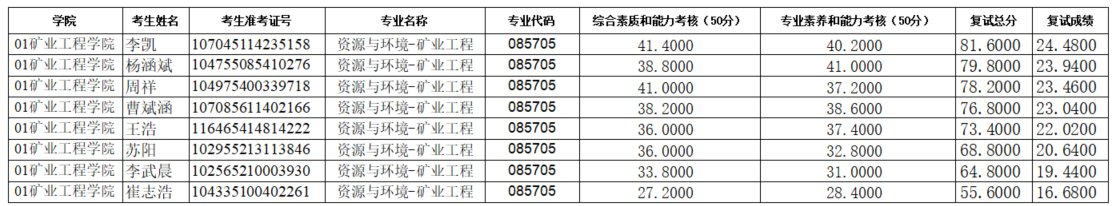 金年会jinnianhuicom2025年硕士研究生招生考试(资源与环境-矿业工程)第二次调剂复试成绩