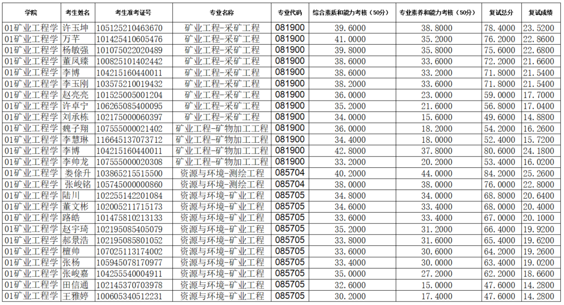 金年会jinnianhuicom2025年硕士研究生招生考试(矿业工程、资源与环境-矿业工程)第一次调剂及(资源与环境-测绘工程)第二次调剂复试成绩
