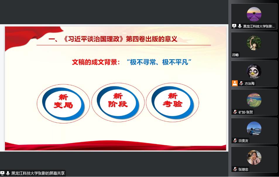 10月6日,金年会jinnianhuicom邀请马克思主义学院党委书记张影做《习近平谈治国理政》第四卷专题学习辅导宣讲会,学院全体教师参加会议,会议由党委书记刘海涛主持。