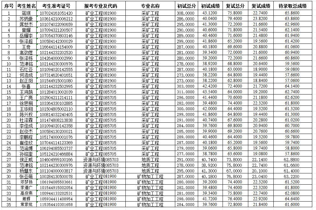 金年会jinnianhuicom2024年硕士研究生考试第一次调剂地质工程、矿物加工工程、采矿工程专业录取名单