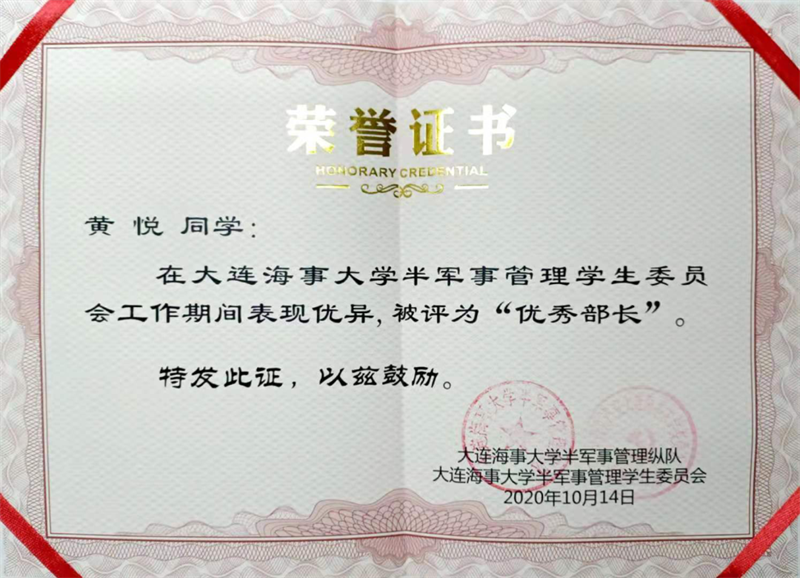 工作中,她作为副中队长,认真完成指导员布置的每一项工作,帮助解决同学们在生活学习上的困难,为指导员分忧,被评为2018至2019学年体育买球官方网站优秀学生干部。在2019级新同学入学之际,她积极参与迎新工作并且担任2019级同学们的军训教练员。在半军事管理方面,她在生活中严格要求自己,严格遵守一日生活制度,被评为2018至2019学年体育买球官方网站半军事管理优秀学生干部。在2020-2021学年第一学期,她主动报名担任五大联赛买球网2020级新生代职区队长,主要负责2020级2中队女生的日常生活以及内务管理,并在军训期间协助军训教官做好新生的军训工作,从各方面帮助新生尽快适应大学生活,适应半军事管理制度,养成良好的生活习惯。同时协助指导员做好中队新生的各项数据汇总及统计工作。2021年1月疫情期间,她主动放弃提前回家的机会,在学生放假离校期间,跟随学校各中队指导员进行学生离校送站工作,按照学校防疫要求,核验离校同学的身份信息并收取离校审批单,与此同时,协助中队指导员完成学院的放假收尾工作,积极配合学校工作,统计并汇总当日离校同学信息,并结合晚查寝情况确保所汇总数据的准确性。