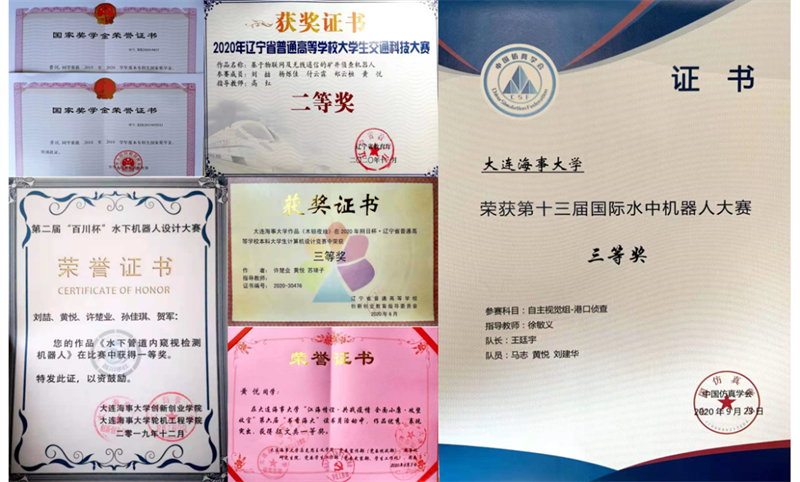 在学习之余,她积极参加各类科创比赛,提升自身科研能力。在2019年,获得第二届“百川杯”水下机器人设计大赛一等奖;在2020年,获得辽宁省普通高等学校本科大学生计算机设计竞赛三等奖、第十三届国际水中机器人大赛三等奖、辽宁省普通高等学校大学生交通科技大赛二等奖、第二届水下智能装备创新设计大赛概念组二等奖、体育买球官方网站第六届“书香海大”读书月征文类一等奖;在2021年,“挑战杯”项目“探海科技——船体智能检测与水下SLAM机器人”入围省赛。