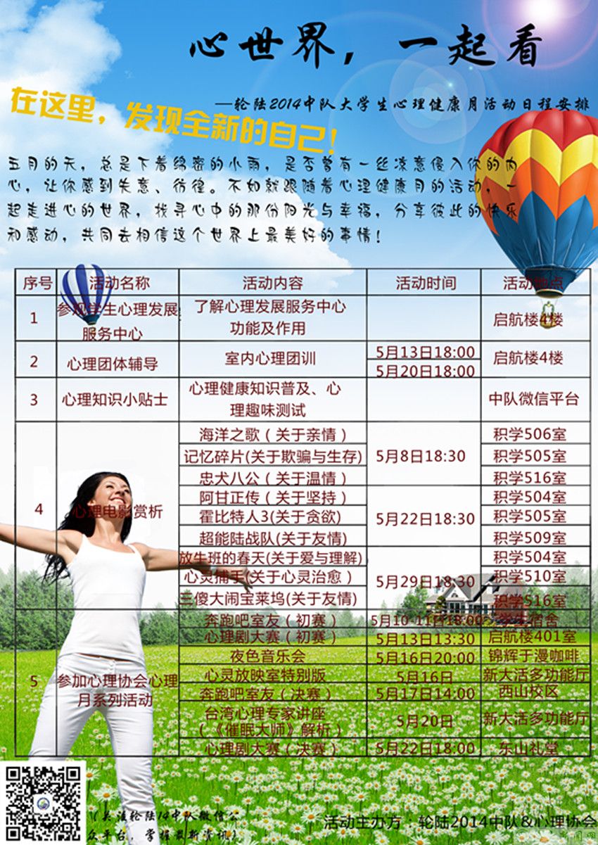 本次心理健康月活动包括参观校心理发展服务中心、室内心理团体辅导、心理知识小贴士、心理电影赏析和参加校心理月系列活动,通过一个月的心理健康宣传教育活动,推进大学生对心理健康教育的认识、从内心深处体会到心理健康的重要。使大学生清醒地认识到,只有拥有健全的人格、愉快的情绪和健康的心理,才能为未来的发展奠定坚实的基础。