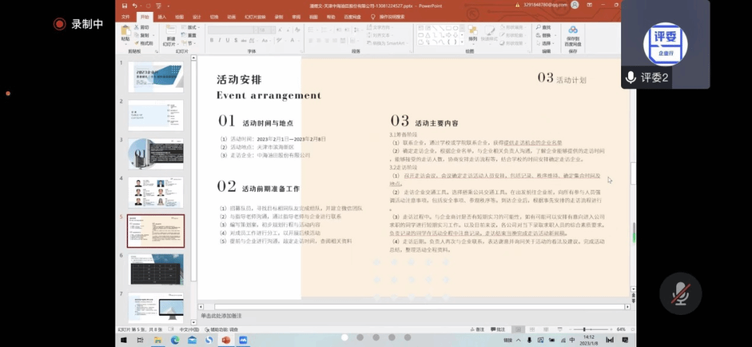 为深入学习贯彻党的二十大精神,积极引领学生在社会实践的大课堂中“受教育、长才干、作贡献”,持续推进学院社会实践工作顺利开展,五大联赛买球网于2023年1月8日召开“强国企业行”寒假社会实践线上答辩会。会议由学院团委实践部组织召开,学院团委书记裴长盛,学院指导员高梓博,郑云桓和姜宝深作为评委参会,11支“强国企业行”队伍进行答辩展示。